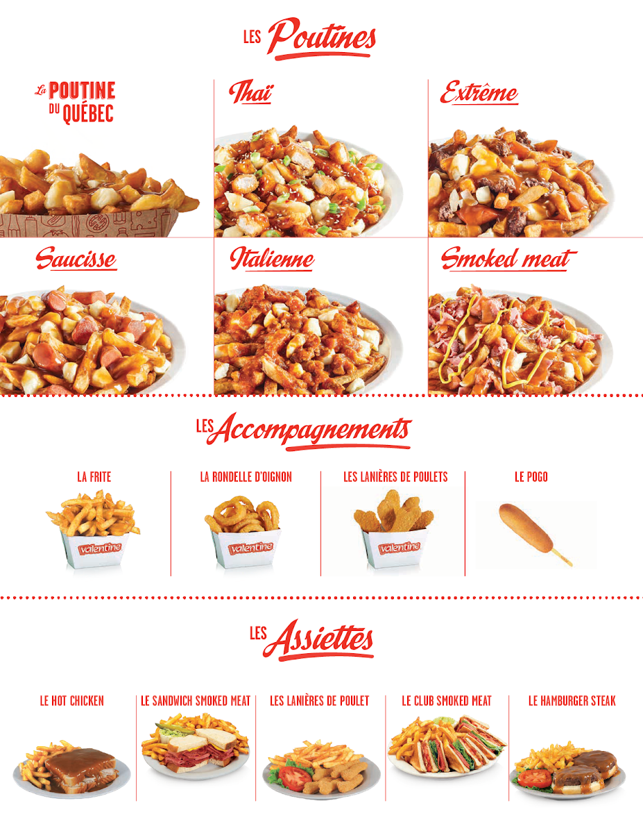 The menu at Valentine Mascouche feels focused and reassuringly familiar, built around comfort food that delivers exactly what it promises. Dishes are presented without unnecessary complexity, making it easy to choose based on appetite and mood. The Club Sandwich Platter stands out as a hearty, well-balanced option, offering a satisfying combination that works equally well for a quick lunch or a relaxed meal. For something more iconic, the Le Fameux Hot-Dog Famous Hot Dog reflects the restaurant’s identity, highlighting a classic recipe that prioritizes flavor, simplicity, and consistency. No visit would feel complete without La Poutine, a signature item that embodies the essence of Canadian fast-casual dining, rich and indulgent while remaining approachable. Taken together, these featured items showcase a menu that is cohesive and thoughtfully assembled, emphasizing recognizable favorites prepared in a way that appeals to both regular customers and first-time visitors.